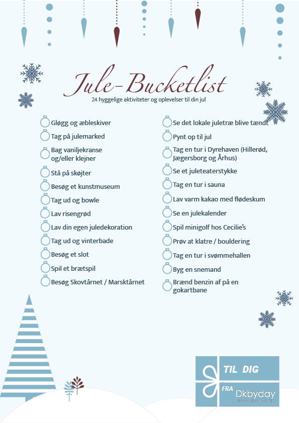Den var super populær til efteråret – derfor har vi genskabt den til julen. Vores Jule-Bucketlist kan være dit udgangspunkt for masser af hyggelige og spændende aktiviteter og oplevelser i julen!